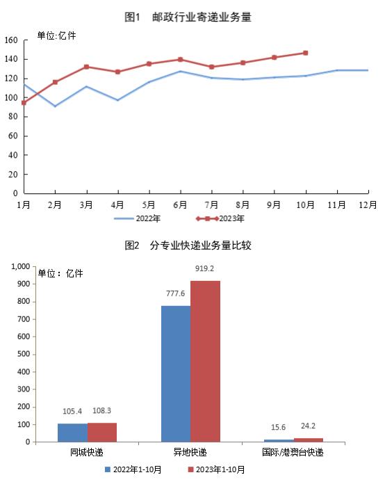 1-10月,同城快遞業務量累計完成108.3億件,同比增長2.7%;異地快遞業務量累計完成919.2億件,同比增長18.2%;國際/港澳臺快遞業務量累計完成24.2億件,同比增長55.1%。