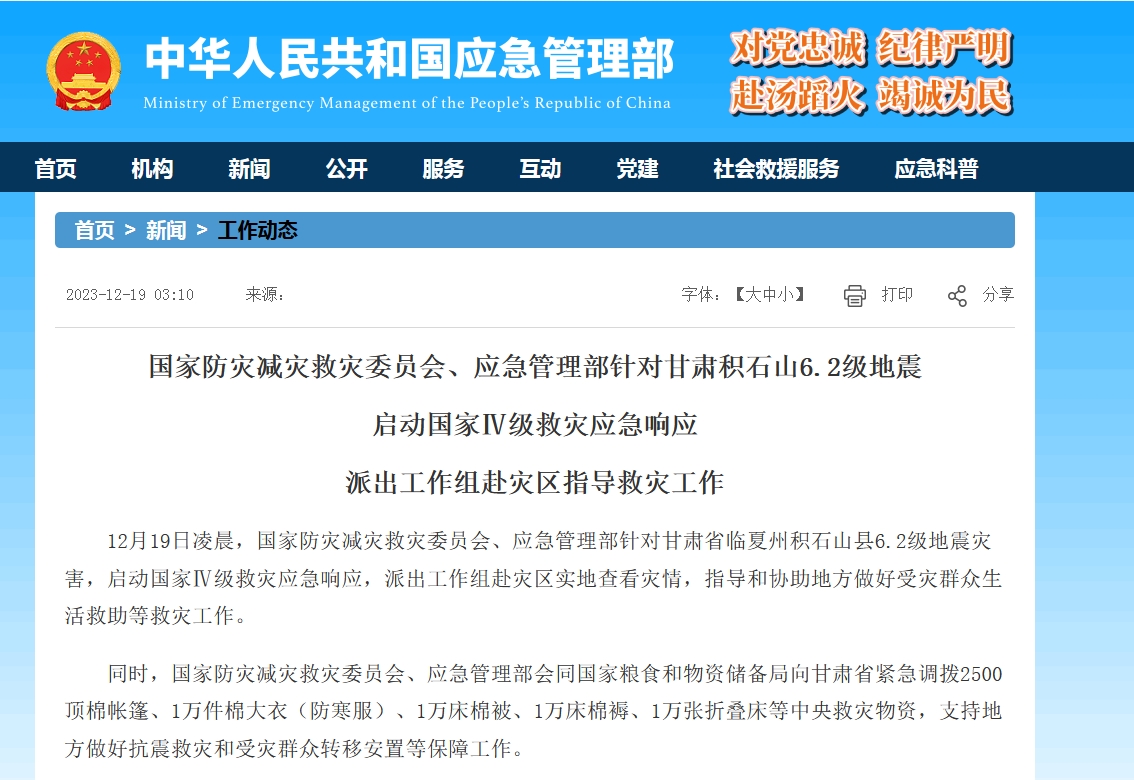 中新網12月19日電 據應急管理部網站消息,12月19日凌晨,國家防災減災救災委員會、應急管理部針對甘肅省臨夏州積石山縣6.2級地震災害,啟動國家Ⅳ級救災應急響應,派出工作組赴災區實地查看災情,指導和協助地方做好受災群眾生活救助等救災工作。