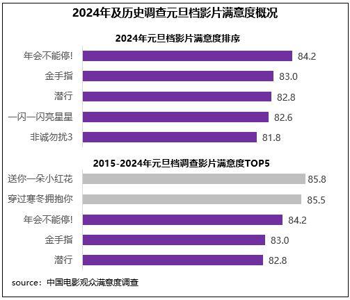中國電影觀眾滿意度調查 2024年元旦檔調查結果顯示,元旦檔電影觀眾滿意度得分83.0分,環比增長0.2分。檔期以多元化且高契合度的影片供給陪伴觀眾跨年,得到了較高的滿意度評價,5部影片中有4部進入歷史調查19部元旦檔影片的滿意度前十,喜劇《年會不能停!》以84.2分領銜,《金手指》83.0分居第二位,《潛行》《一閃一閃亮星星》均超82分,《非誠勿擾3》超81分。