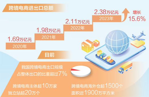 據海關測算,2023年,我國跨境電商進出口總額2.38萬億元,增長15.6%。其中,出口1.83萬億元,增長19.6%;進口5483億元,增長3.9%。跨境電商快速發展,既滿足了國內消費者多樣化個性化需求,又助力我國產品通達全球,成為外貿發展的重要動能。
