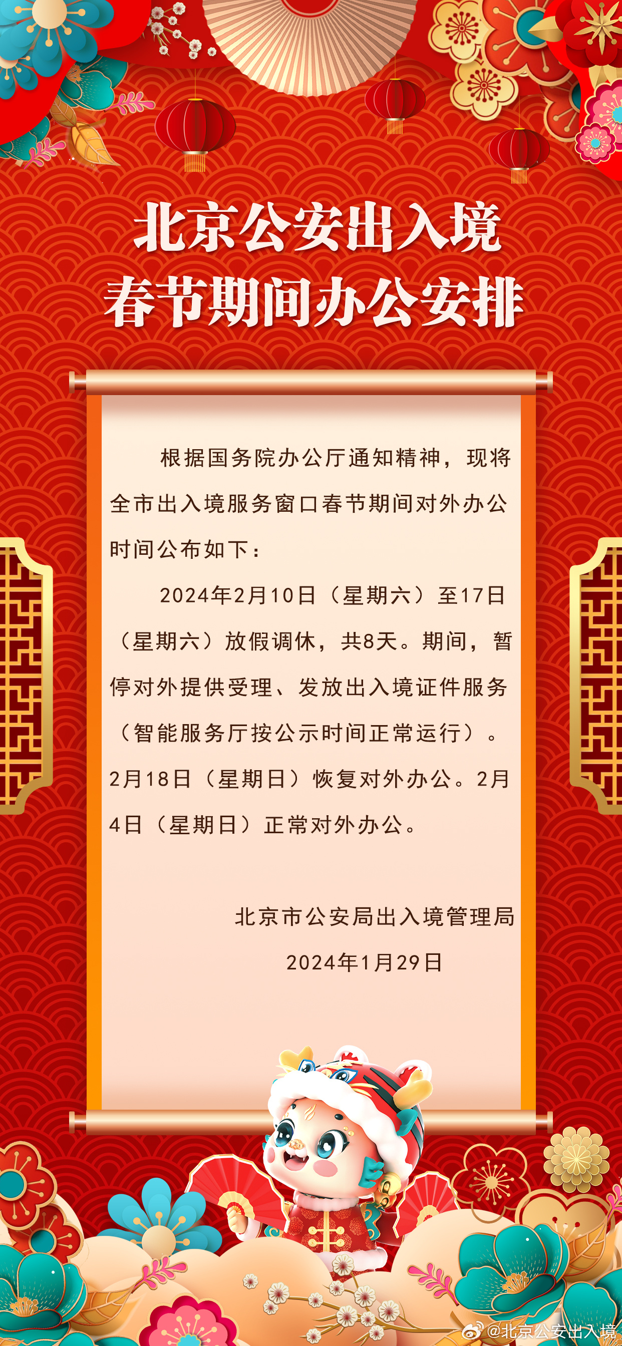 中新網1月29日電 據北京市公安局出入境管理局官方微博消息,北京市公安局出入境管理局發布春節期間辦公安排:北京市出入境服務窗口2月10日至17日(大年初一至初八)放假調休,共8天。期間,暫停對外提供受理、發放出入境證件服務(智能服務廳按公示時間正常運行)。2月18日(星期日)恢復對外辦公。2月4日(星期日)正常對外辦公。
