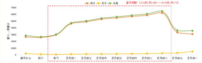 預計春節期間(含除夕),全國高速公路日均流量約為5030萬輛,較2023年春節同期日均增長11.6%左右。整個春節流量峰值出現在春節假期的最后一天(正月初八),預計達6520萬輛左右,創歷年春節流量新高。