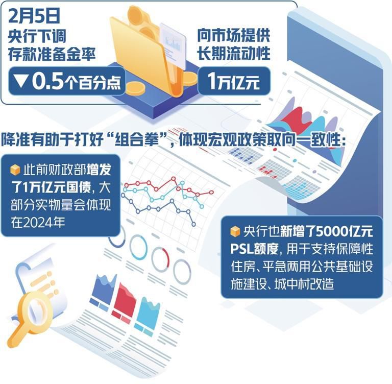 2月5日,今年首次降準落地。此前,中國人民銀行行長潘功勝在1月24日舉辦的國新辦發布會上宣布,2月5日下調存款準備金率0.5個百分點,向市場提供長期流動性1萬億元。
