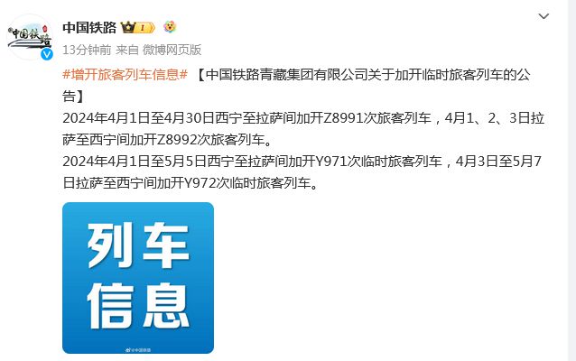 中新網(wǎng)3月22日電 據(jù)中國國家鐵路集團(tuán)有限公司官方微博消息,中國鐵路青藏集團(tuán)有限公司3月22日發(fā)布關(guān)于加開臨時(shí)旅客列車的公告:2024年4月1日至4月30日西寧至拉薩間加開Z8991次旅客列車,4月1、2、3日拉薩至西寧間加開Z8992次旅客列車。2024年4月1日至5月5日西寧至拉薩間加開Y971次臨時(shí)旅客列車,4月3日至5月7日拉薩至西寧間加開Y972次臨時(shí)旅客列車。