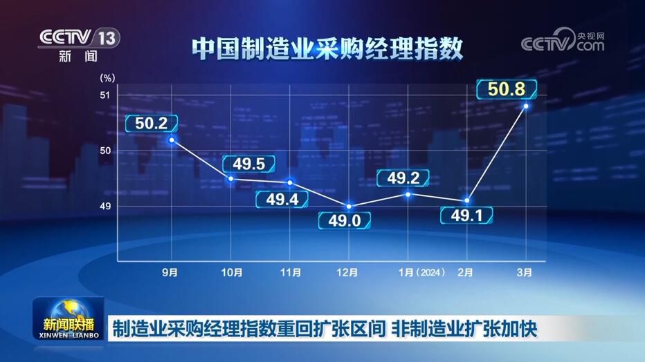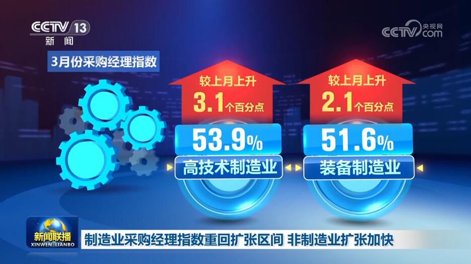 央視網消息:3月31日,《新聞聯播》報道了3月份中國采購經理指數、各地重大工程建設,以及生態保護、春耕等領域取得的新成績、新成果,各行各業奮力拼搏,匯聚成向上的蓬勃力量,繪就出中國經濟萬千氣象。