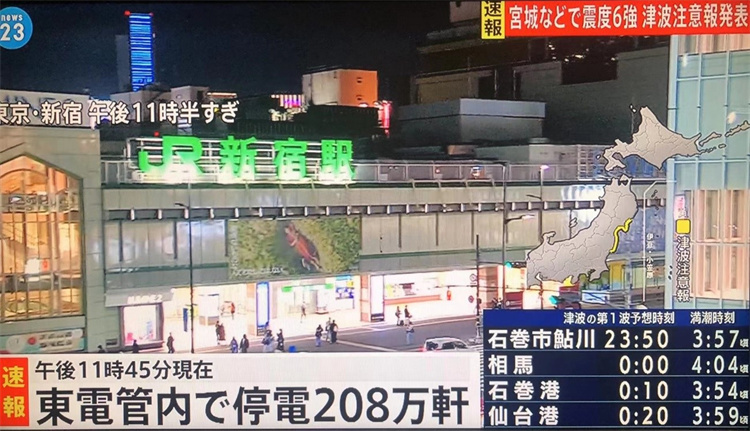 3月16日日本福島縣海域發生7.4級地震,導致大規模停電。圖片來源:日本電視臺報道截圖