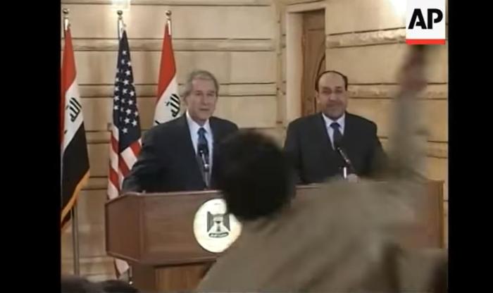 2008年12月,時任美國總統小布什在伊拉克首都巴格達的新聞發布會上,被伊拉克記者蒙塔達爾·扎伊迪扔鞋。圖片來源:美聯社視頻截圖