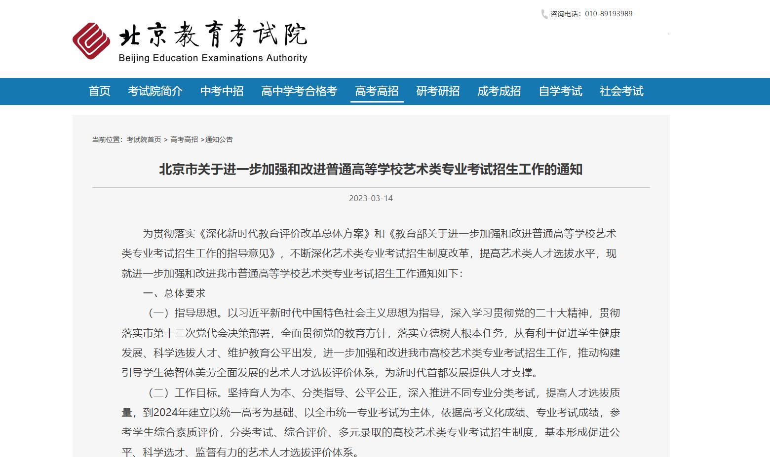 二是部分藝術類專業將取消專業能力考試。據北京教育考試院上述《通知》,2024年起,藝術史論、戲劇影視文學等高校藝術類專業,直接依據考生高考文化課成績、參考考生綜合素質評價,擇優錄取。