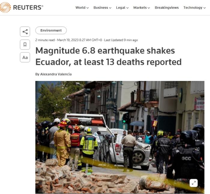 中新網3月19日 綜合外媒報道,當地時間18日約12時,厄瓜多爾發生6.8級地震,造成至少14人遇難,超過380人受傷,多處房屋、學校和醫療中心遭到結構性破壞。