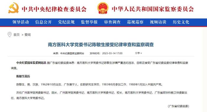 3月14日,中央紀委國家監委發布兩則涉及醫藥衛生領域干部被查的消息,落馬官員分別為南方醫科大學黨委書記陳敏生,廣西壯族自治區醫療保障局原黨組書記、局長王忠平。