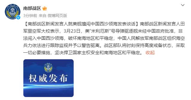 中新網3月23日電 據中國人民解放軍南部戰區官方微博消息,南部戰區新聞發言人田軍里空軍大校表示,3月23日,美“米利厄斯”號導彈驅逐艦未經中國政府批準,非法闖入中國西沙領海,破壞南海地區和平穩定,中國人民解放軍南部戰區組織??毡σ婪ㄟM行跟蹤監視并予以警告驅離。戰區部隊將時刻保持高度戒備狀態,采取一切必要措施,堅決捍衛國家主權安全和南海地區和平穩定。