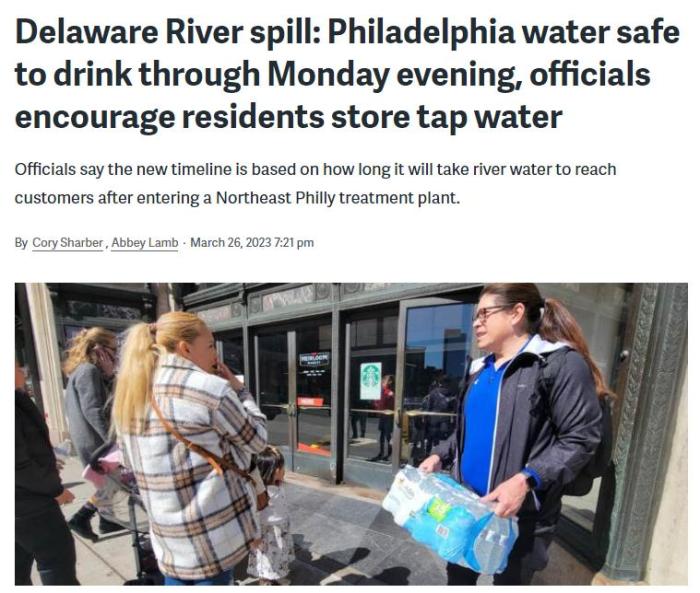 中新網3月27日電 綜合外媒報道,近日,美國賓州布里斯托爾一家工廠發生泄漏事故,大量化學物質流入特拉華河一條支流中。事故發生后,費城官員建議當地民眾使用瓶裝水,引發恐慌性購買。
