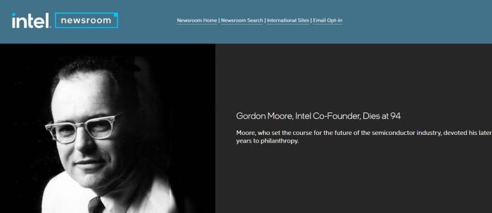 英特爾官網發布的戈登·摩爾去世的消息。圖片來源:英特爾官網截圖