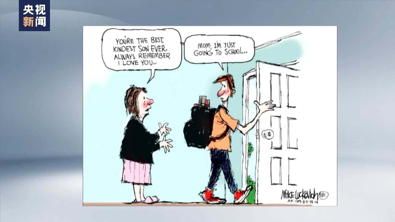 槍支暴力已經成為美國孩子的“頭號殺手”。在這幅漫畫中,母親流著眼淚,對準備出門上學的孩子叮囑道,“你是最好、最善良的兒子,永遠要記得這一點,我愛你。” 孩子則有點疑惑地說,“媽媽,我只是去學校。” 這就是校園槍擊案頻發令無數父母終日膽戰心驚的真實寫照。