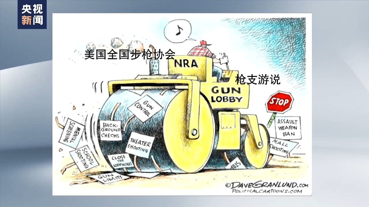在這幅漫畫中,一名男子聽著音樂,漫不經心地開著一輛寫有“美國全國步槍協會”、“槍支游說”字樣的壓路機一路向前,撞倒了前方赫然在目的“停止”標志。在他身后,“攻擊性武器禁令”、“控槍”、“背景調查”等標志被一一碾壓,接二連三發生的“校園槍擊”、“劇院槍擊”、“商場槍擊”等慘痛事件也完全被無視。