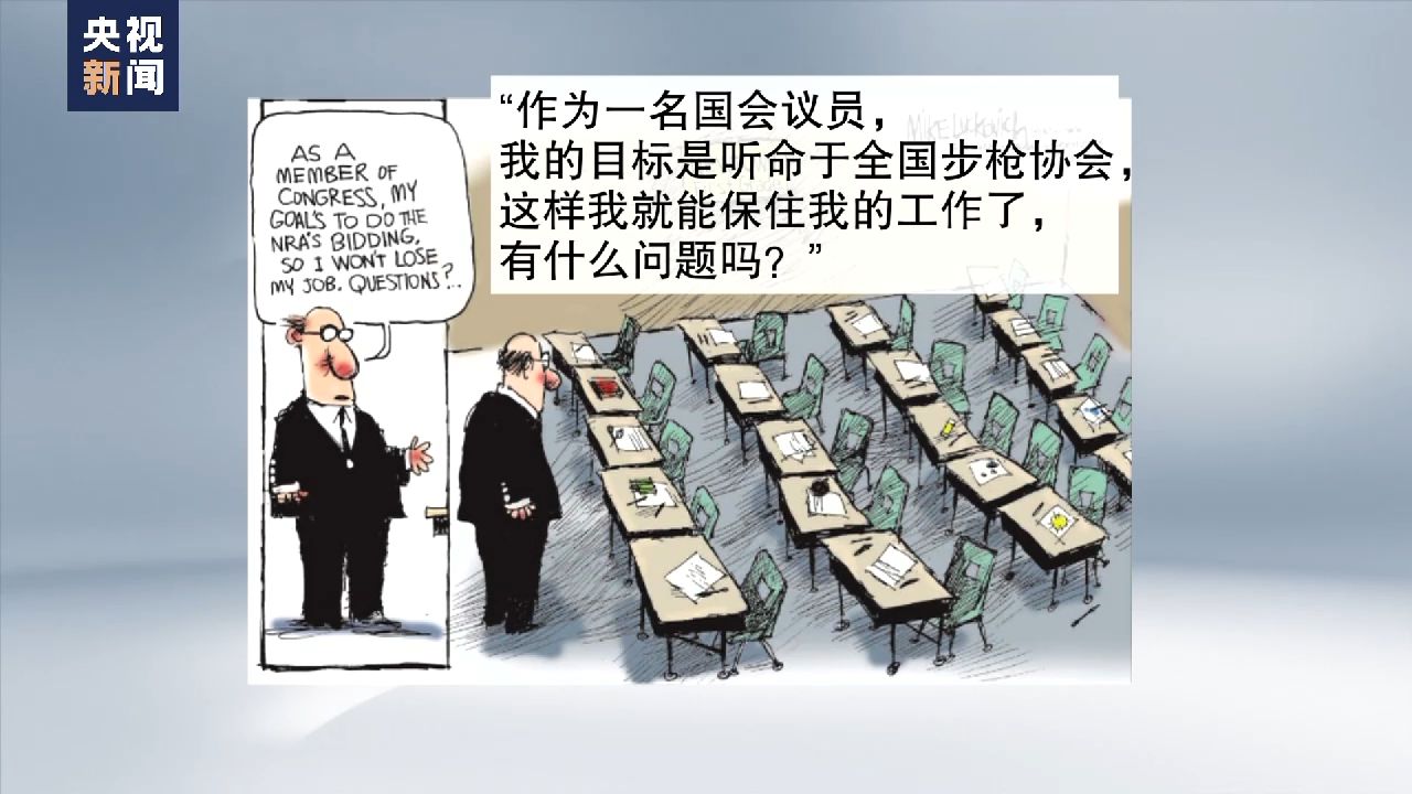 在另一幅漫畫中,在一間寫有“紐敦市一年級”的教室里,擺放著二十張課桌椅,卻唯獨不見孩子的蹤影。漫畫左側,這名來探視的議員心里想的是,“作為一名國會議員,我的目標是聽命于全國步槍協會,這樣我就能保住我的工作了,有什么問題嗎?”
