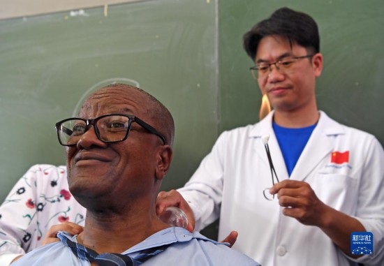 4月3日,在納米比亞溫得和克的伊曼紐爾·謝菲迪中學課堂上,校長卡奇翁瓜體驗拔火罐。新華社發(穆薩·卡薩克攝)