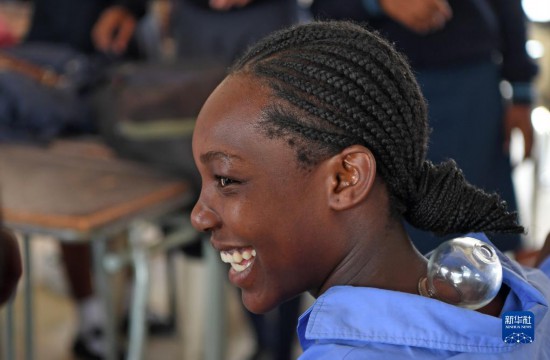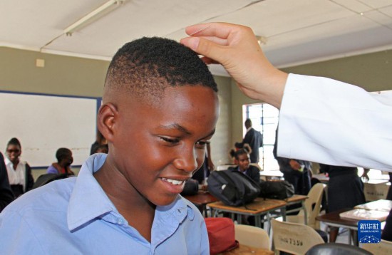 4月3日,在納米比亞溫得和克的伊曼紐爾·謝菲迪中學課堂上,一名學生體驗艾灸。新華社發(穆薩·卡薩克攝)