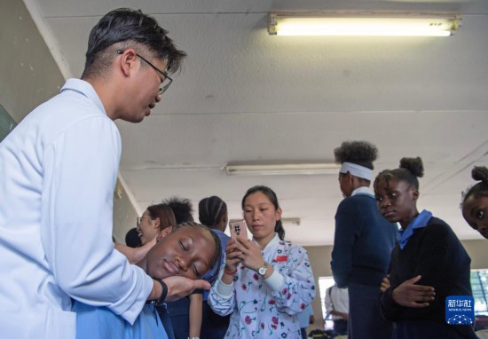4月3日,在納米比亞溫得和克的伊曼紐爾·謝菲迪中學課堂上,一名學生體驗針灸。新華社發(穆薩·卡薩克攝)