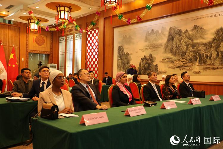 全體與會者共同觀看了阿文版《中國共產(chǎn)黨國際形象網(wǎng)宣片》。使館2名青年外交官代表結(jié)合自身工作經(jīng)歷,分別以《從三個關鍵詞讀懂中共二十大重要意義》和《從十年之變看中國式現(xiàn)代化》為題,深入淺出闡釋中共二十大的時代意義和深遠影響,以及中國式現(xiàn)代化對發(fā)展中國家的重要啟示。開羅大學3名師生代表結(jié)合自身工作和學習經(jīng)歷,積極分享對中國式現(xiàn)代化的認識和體會,高度評價中國發(fā)展成就,贊賞中國通過“一帶一路”合作助力埃及發(fā)展,表示愿為推動埃中關系進一步發(fā)展貢獻青春力量。