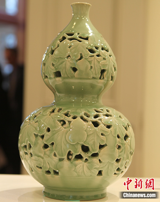 圖為展品《葫蔭綿長》,因其燒制難度大,是公認的龍泉青瓷精品。 中新社記者 德永健 攝