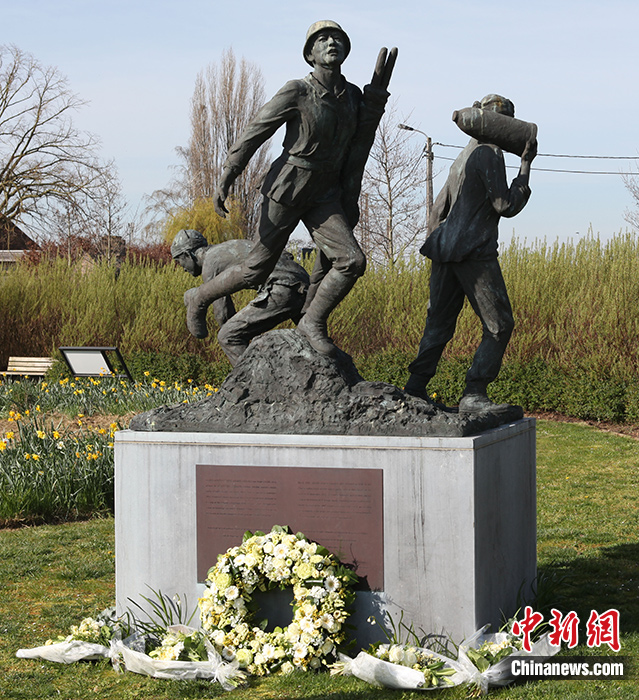 圖為在波普林格一戰華工紀念園,一戰華工紀念雕像前擺放著花環花束。 中新社記者 德永健 攝