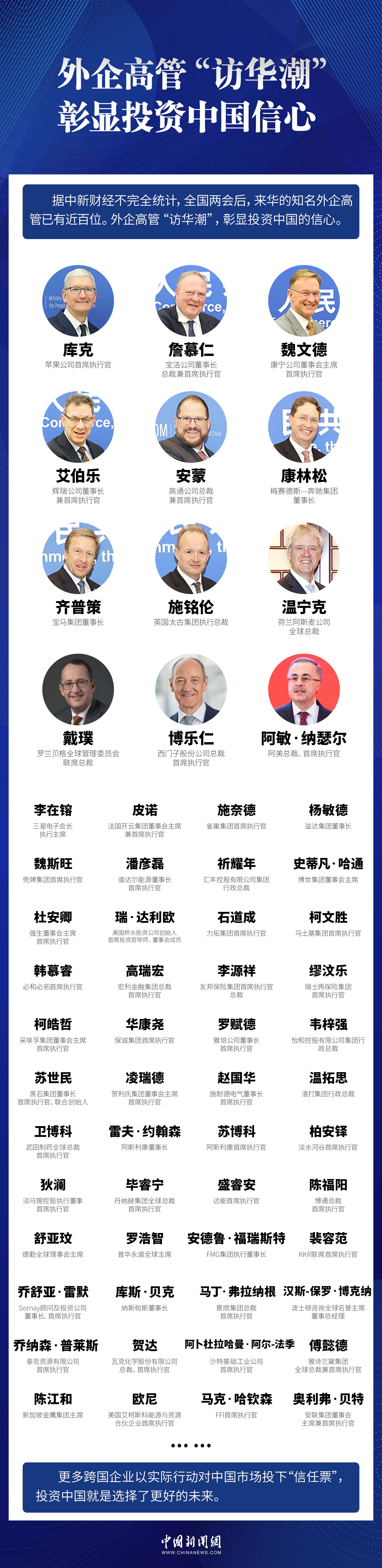 中新網北京4月7日電 (記者 李金磊)時下,外企高管正掀起“訪華潮”。據中新財經不完全統計,全國兩會后,來華的知名外企高管已有近百位。