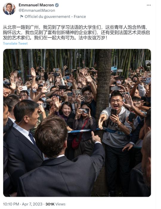 馬克龍寫道,“從北京一路到廣州,我見到了學習法語的大學生們,這些青年人飽含熱情、胸懷遠大,我也見到了富有創新精神的企業家們,還有受到法國藝術靈感啟發的藝術家們。我們在一起大有可為。法中友誼萬歲!”