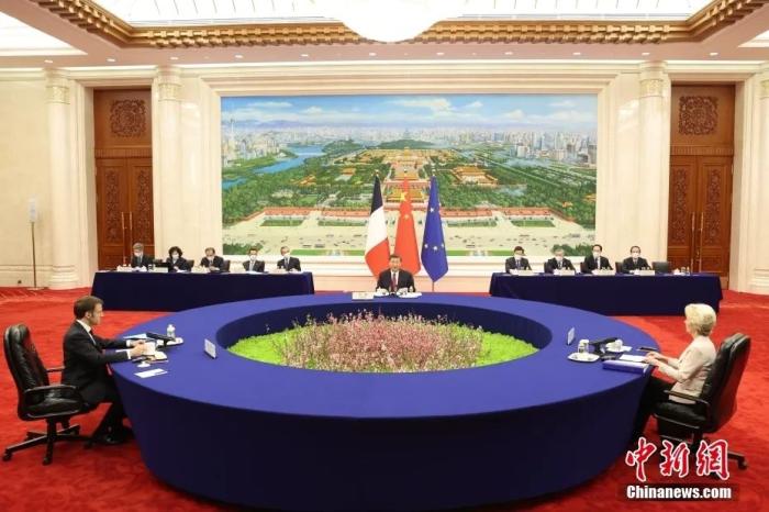 4月6日下午,中國國家主席習(xí)近平在北京人民大會堂同法國總統(tǒng)馬克龍、歐盟委員會主席馮德萊恩舉行中法歐三方會晤。中新社記者 盛佳鵬 攝