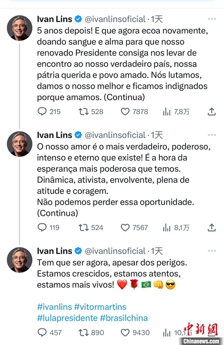 巴西音樂家伊萬·林斯在社交媒體連發多條留言,引發網絡熱潮。截圖