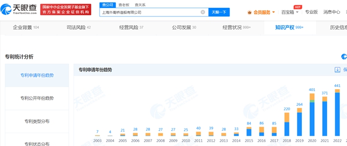 天眼查顯示,近三年,外高橋造船專利申請數量猛增,2020年為401件,2021年371件,2022年達到441件。這其中有不少專利涉及到大型郵輪,例如“大型郵輪反彈式水封地漏”“大型郵輪醫院抽風管過濾裝置”等。