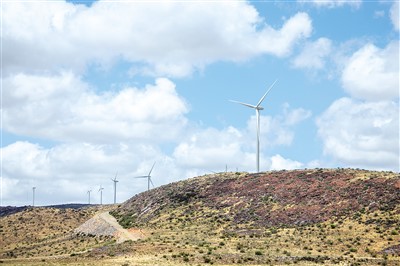 在南非北開普省德阿鎮,中國龍源電力集團南非公司運營的德阿風電項目風機。