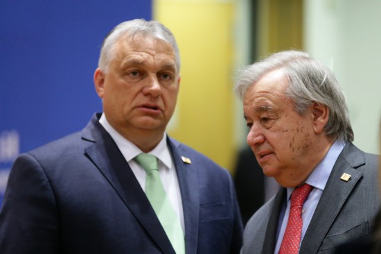 3月23日,在比利時布魯塞爾的歐盟總部,聯合國秘書長古特雷斯(右)與匈牙利總理歐爾班在歐盟峰會開始前交談。(新華社記者鄭煥松攝)