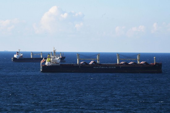 2022年8月6日,從烏克蘭出發的第二批運糧船抵達土耳其伊斯坦布爾的博斯普魯斯海峽黑海入海口附近。(新華社記者沙達提攝)