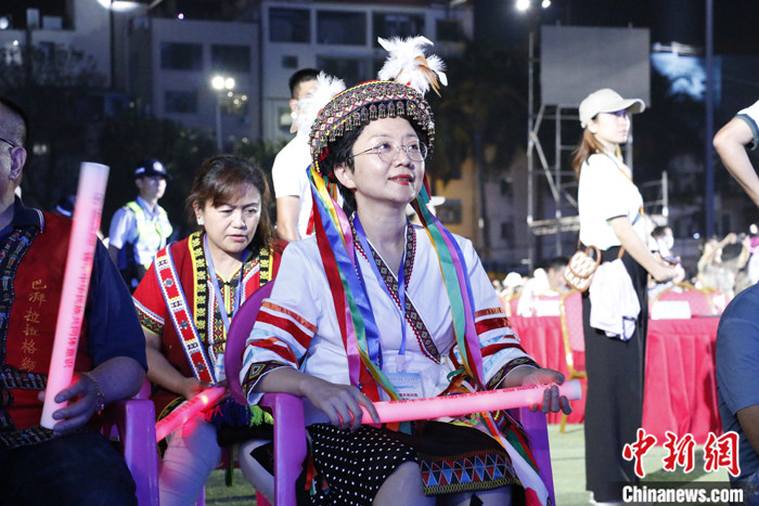 圖為4月22日晚,海南省臺聯副會長劉芳穎身著臺灣少數民族服飾出席在樂東舉行的“三月三”開幕活動。 中新社記者 朱賀 攝