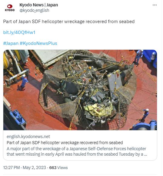 據報道,潛水員此前在伊良部島以北6公里海域106米深處,發現了失聯直升機主體部分。5月2日,該部分被打撈網撈出水面。