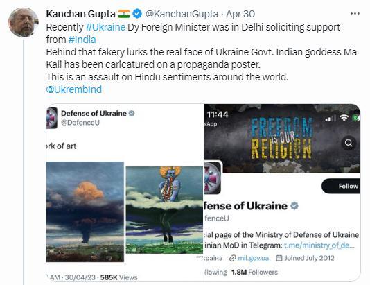 據俄新社報道,印度信息和廣播部高級顧問古普塔也對此表達了強烈的不滿,他在推特上轉發這一截圖,并寫道,“最近烏克蘭副外長曾在新德里請求印度支持。這張偽造圖背后隱藏著烏克蘭政府的真實面目。印度教女神卡莉被諷刺地畫在一張宣傳海報上。這是對全世界印度教徒感情的攻擊”。