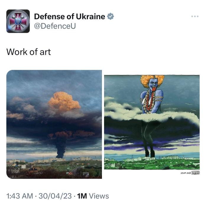 據俄新社、《印度斯坦時報》等多家媒體描述,烏國防部4月30日發布的這條推文中包含兩張圖片,第一張描繪了塞瓦斯托波爾灣一油庫遭無人機襲擊后升起的煙柱;另一張則是以第一張為基礎創作的漫畫,爆炸的濃煙中多了一名女性形象,她擺出與瑪麗蓮·夢露掩住裙擺相似的姿勢,而這一女性形象本身又與印度教女神卡莉相似。烏克蘭國防部對圖片的描述是“藝術作品(work of art)”。