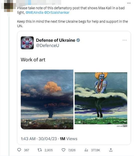 有推特網友@印度外交部和外長蘇杰生“請注意這篇詆毀女神卡莉的誹謗帖子。下次烏克蘭在聯合國尋求幫助和支持時,請記住這一點。”