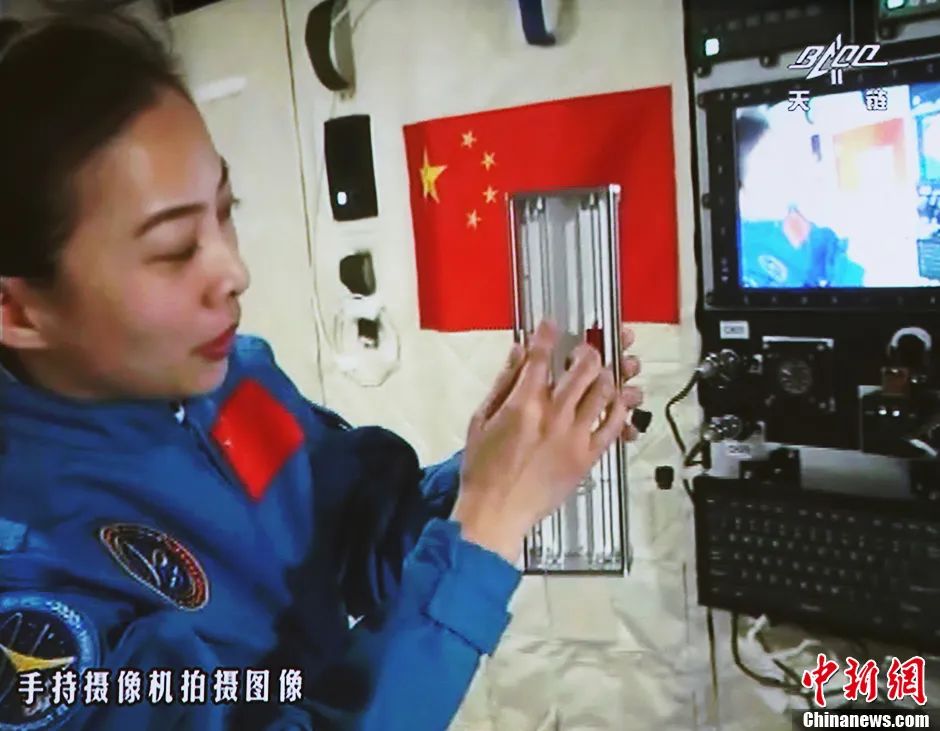 2013年6月20日10時許,神舟十號航天員在天宮一號開展基礎物理實驗,為青少年進行中國首次太空授課。圖為王亞平講授質量測量。中新社發 秦憲安 攝