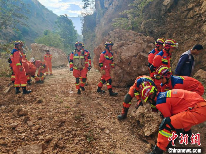 圖為消防指戰員正在地震現場開展救援?!≡颇鲜∠谰仍傟牴﹫D