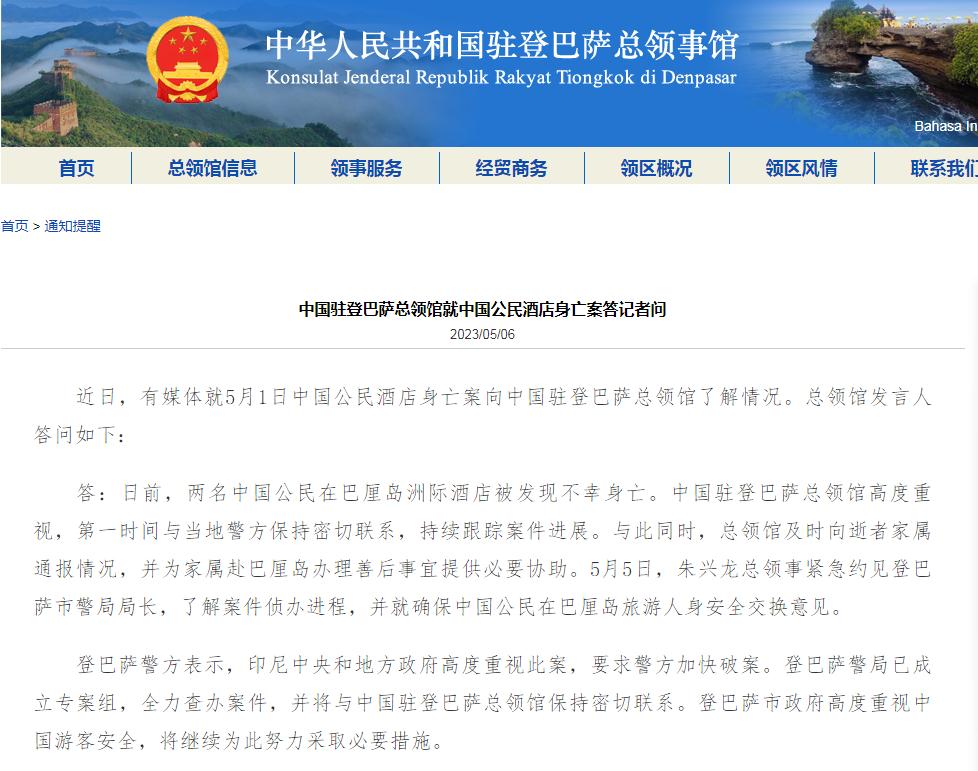 答:日前,兩名中國公民在巴厘島洲際酒店被發現不幸身亡。中國駐登巴薩總領館高度重視,第一時間與當地警方保持密切聯系,持續跟蹤案件進展。與此同時,總領館及時向逝者家屬通報情況,并為家屬赴巴厘島辦理善后事宜提供必要協助。5月5日,朱興龍總領事緊急約見登巴薩市警局局長,了解案件偵辦進程,并就確保中國公民在巴厘島旅游人身安全交換意見。