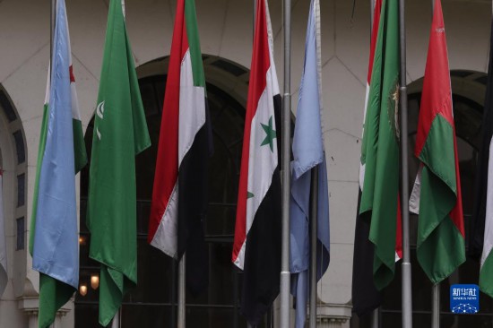 這是5月7日在位于埃及開羅的阿拉伯國家聯盟總部拍攝的敘利亞國旗(左四)。新華社發(艾哈邁德·戈馬 攝)