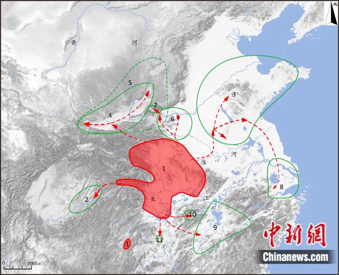 屈家嶺文化對外擴張路線示意圖(紅色區域為屈家嶺文化主要分布范圍)。受訪者 供圖