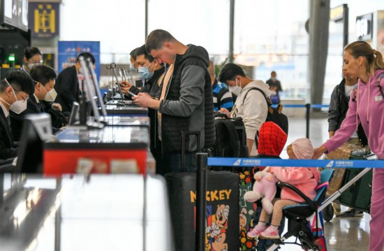 4月25日,南航工作人員在為旅客辦理值機手續。4月25日,一架中國南方航空CZ6015航班從烏魯木齊地窩堡國際機場起飛,前往土庫曼斯坦首都阿什哈巴德。南航新疆分公司介紹,這是目前國內恢復的首條飛往土庫曼斯坦的國際航線。該航線恢復后,標志著我國新疆與中亞五國航線全面恢復。(新華社記者 王菲 攝)