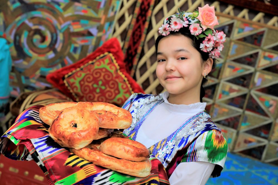 ↑身著民族服飾的哈薩克斯坦女孩在阿斯塔納展示傳統美食,迎接納烏魯斯節。