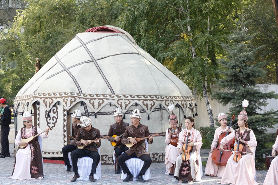 ↑身穿民族服飾的演奏者在吉爾吉斯斯坦首都比什凱克用傳統樂器合奏音樂。