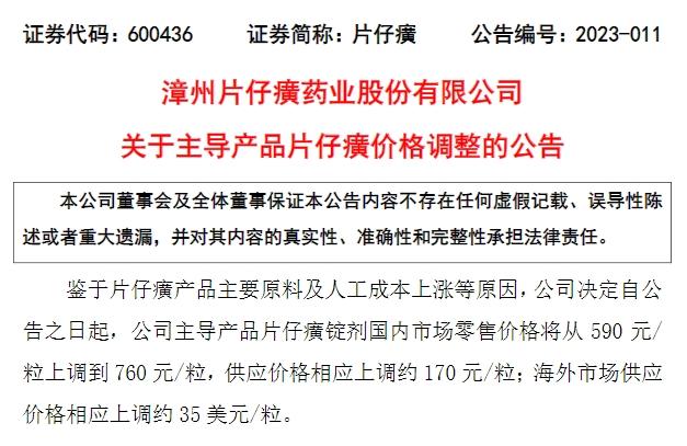 此番漲價的消息源于片仔癀5日發布的一則公告,其中提到,公司決定自公告之日起,主導產品片仔癀錠劑國內市場零售價格將從590元/粒上調到760元/粒,供應價格相應上調約170元/粒;海外市場供應價格相應上調約35美元/粒。