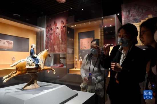 5月8日,游客在西安博物院參觀唐代三彩騰空馬。飛騰的三彩馬上騎有一胡俑,真實再現了絲綢之路上西域胡人急奔長安的生動形象。