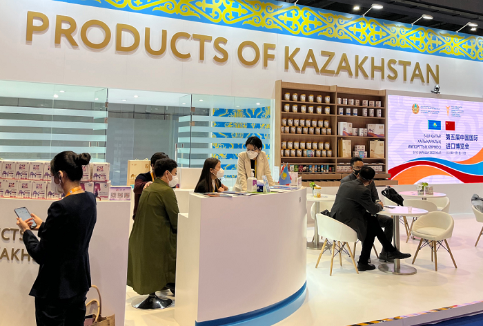 這是2022年11月6日在第五屆進博會上拍攝的哈薩克斯坦產品展區。 新華社記者 鄭冬睿 攝